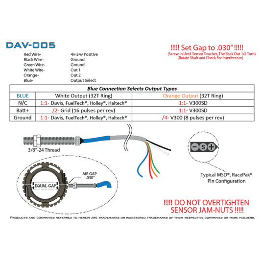 Davis Technologies 8 or 32 Tooth Drive Shaft Sensor – Single Channel Output DAV-001
