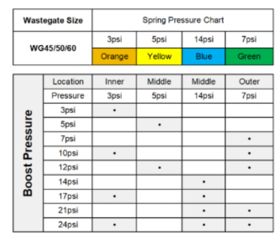 Note: Base pressure is the minimum pressure at which the wastegate begins to open. It does not equal total boost pressure — actual boost can exceed base pressure when using a boost controller.